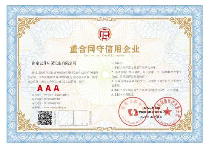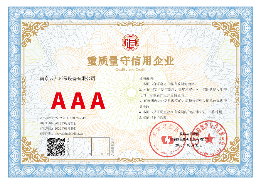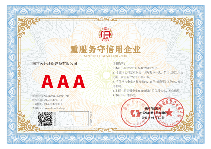 南京云升環(huán)保設備有限公司全體員工愿以環(huán)境保護為己任,以市場為導向,以優(yōu)質(zhì)服務為原則,嚴格的管理、先進的生產(chǎn)工藝、至上的品質(zhì)、完善的售前售后服務,與廣大新老用戶攜手并進,共鑄輝煌。公司已通過ISO9001:2000質(zhì)量管理體系標準認證,成為江蘇省高新企業(yè),并進行不斷的技術改進和創(chuàng)新,為客戶和合作伙伴提供滿意的產(chǎn)品。